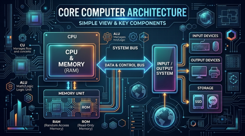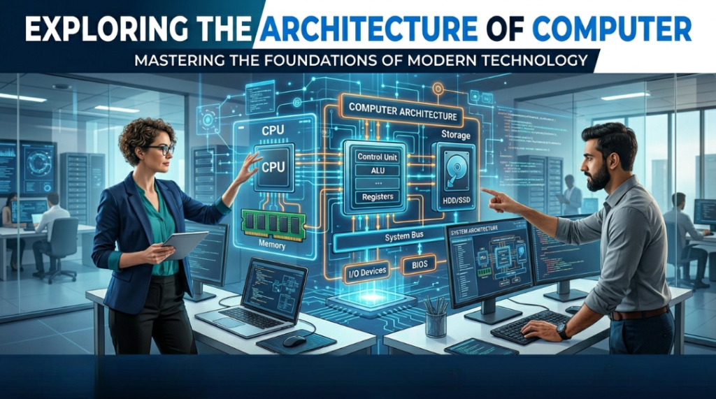 Computer architecture is a framework design that defines the structure and organization of a computer system’s components (memory, I/O devices, CPU), and how these components interact with each other to process data and perform tasks.